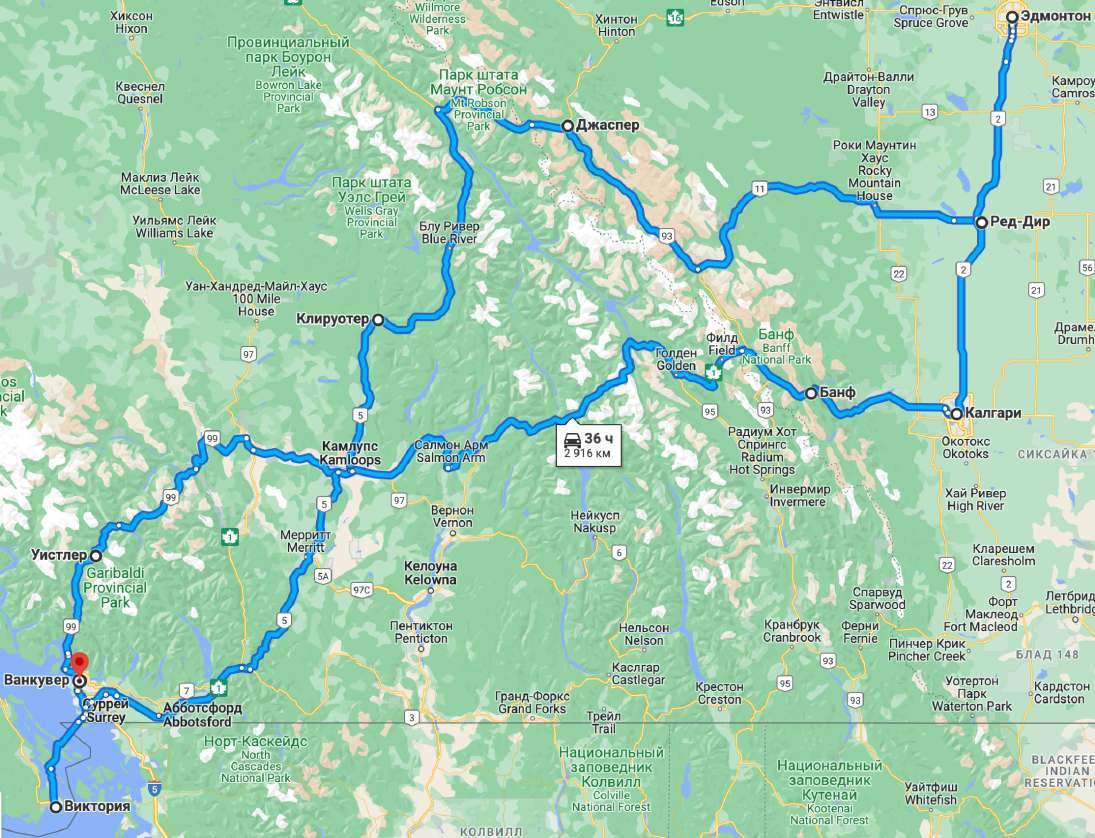 Ванкувер - Вікторія - Вістлер - оз.Нижнє Жоффрі - Камлупс - Клірвотер - ПП Веллс-Грей - Джаспер - НП Джаспер - Льодовик Атабаска - Ред-Дір - Едмонтон - Калгарі - Банф - НП Банф - НП Йохо - НП Глейшер - Ревелсток - Камлупс - Ванкувер